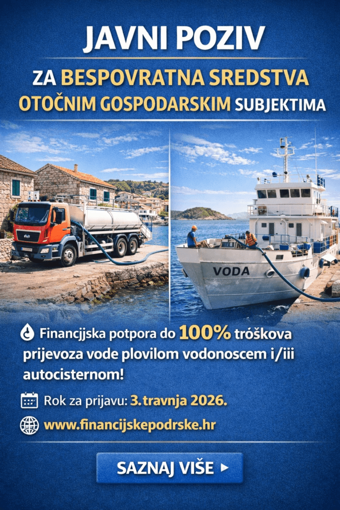 Javni poziv za dodjelu bespovratnih sredstava otočnim gospodarskim subjektima za troškove prijevoza vode plovilom vodonoscem i/ili autocisternom 2026.